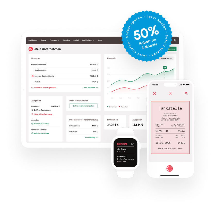 Verabschiede dich von Aktenordnern, Beleg-Chaos und Papierkram! Lexware Office ist eine Buchhaltungssoftware, die deinen Buchhaltungsaufwand auf ein Mindestmaß reduziert.