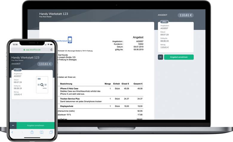 Um Daten mit den Kunden auszutauschen, bietet Lexware Office das Kundencenter. Hier kannst du deinen Kunden Angebote und andere Belege online bereitstellen. Dein Kunde hat das Angebot jederzeit mobil verfügbar und kann es einsehen, prüfen und annehmen. Enthält das Angebot Alternativen oder optionale Positionen, kann dein Kunde die Auswahl selbst festlegen, den Einfluss auf den Preis sehen und das Angebot annehmen. Sobald das Angebot angenommen ist, wird der Lexware Office Anwender informiert.