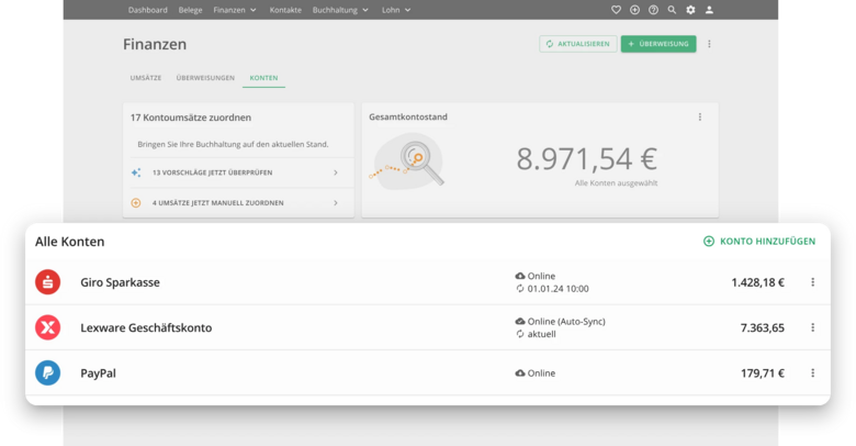 - Banking Modul importiert Kontostände und Umsätze direkt ins System
