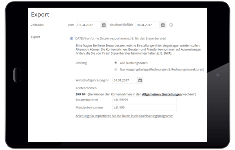 - Flexibler Export: komplette Buchhaltung oder einzelne Daten
