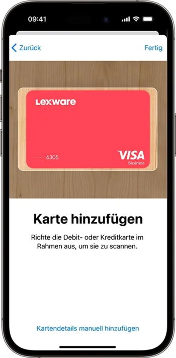 Wie kann ich meine Lexware VISA Business Debitkarte hinzufügen, um mit Apple Pay zu bezahlen?