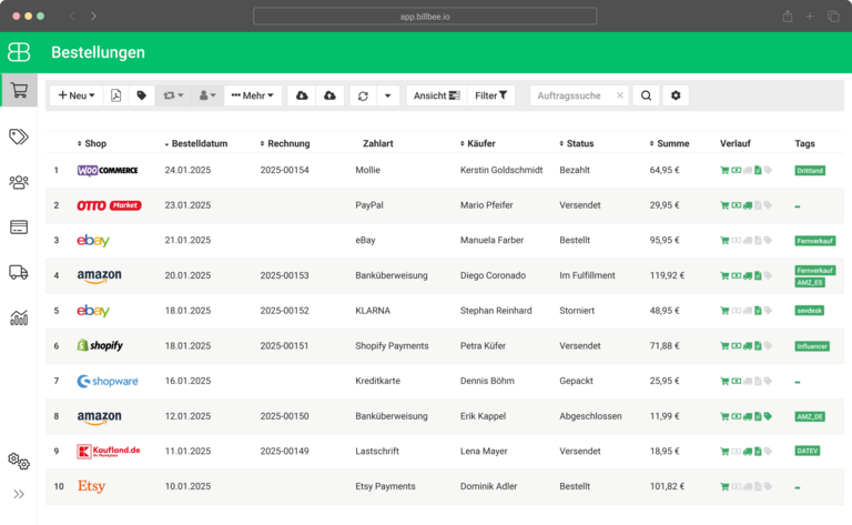 Billbee bietet eine umfangreiche aber einfach zu bedienende Auftragsabwicklung, Warenwirtschaft und Automatisierungslösung für Verkäufer, die Produkte über einen oder mehrere (Online)-Kanäle verkaufen.