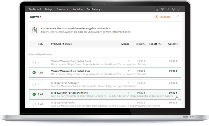 Nach drei Tagen ruft Erika an. Sie möchte die Jacke in blau bestellen und am Kurs für Fortgeschrittene teilnehmen. Alles klar, sagst du und wählst die vom Kundin getroffene Alternative einfach aus. Danach führst du das Angebot mit einem Klick weiter zur E-Rechnung. Die Auswahl wird automatisch in die Rechnung übernommen. Jetzt stehen nur noch die Positionen auf der Rechnung, die die Kundin ausgewählt hat.