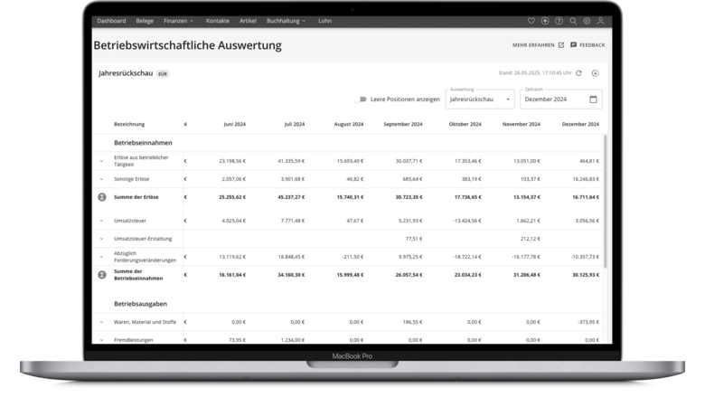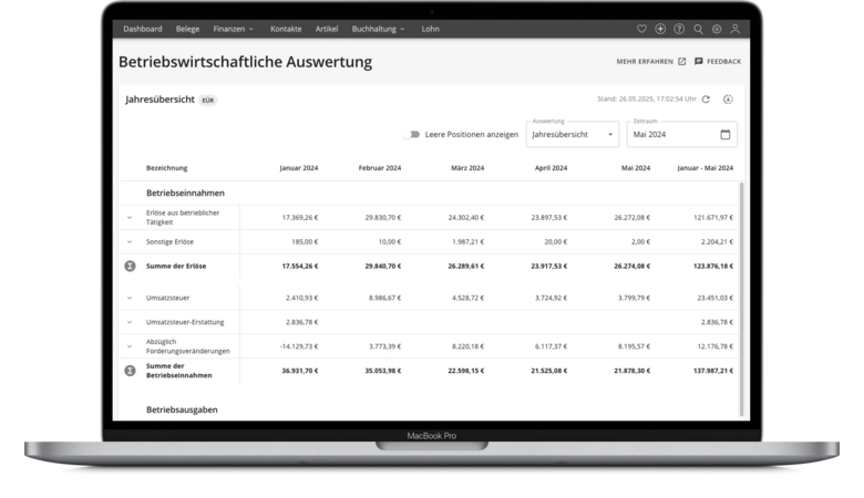 Die aktuelle Jahresübersicht bietet dir die Möglichkeit, eine detaillierte Ansicht aller Monate oder Quartale des laufenden Jahres zu erstellen.