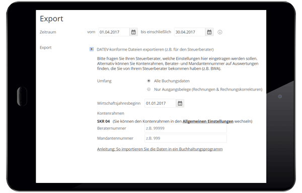 Der Datenexport ermöglicht dir, sämtliche geschäftsrelevanten Informationen wie Buchungen, Belege oder Kontaktdaten schnell und sicher zu exportieren. Er ist besonders hilfreich für Betriebsprüfungen, die Zusammenarbeit mit deinem Steuerberater oder zur Vorbereitung von Marketingaktionen.