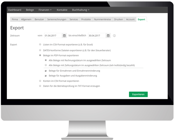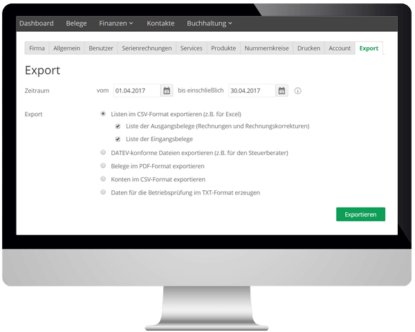 Wähle im Programm unter “Export” einfach den gewünschten Zeitraum aus und welche Daten du für den Prüfer exportieren möchtest. Dazu gehören z.B. Debitoren und Kreditoren, Buchungen und Belege. Anschließend kannst du den Export per Klick starten.