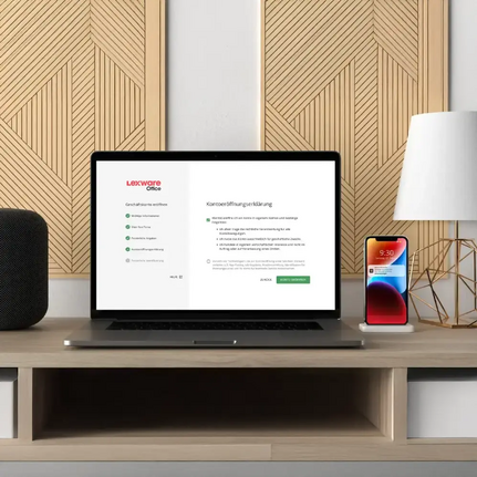 Du eröffnest dein Lexware Geschäftskonto ganz einfach online und führst es bequem per Online-Banking – zu Hause am Desktop oder unterwegs per App. So hast du jederzeit und überall den vollen Überblick.