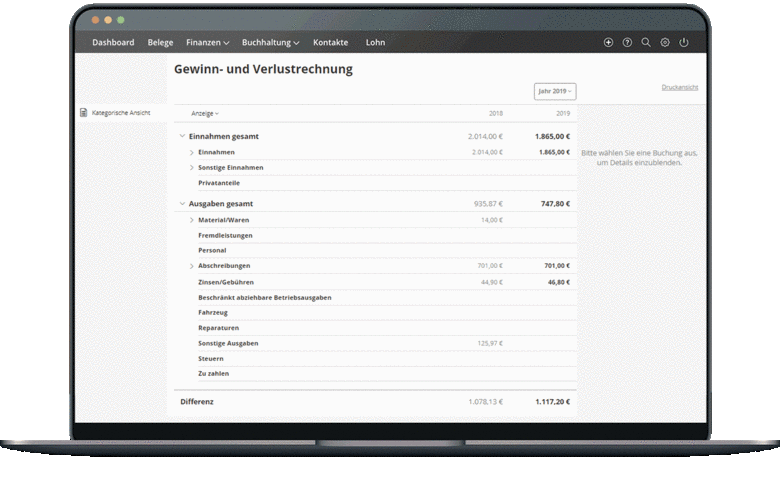 Du kannst jede Einnahme und Ausgabe bis hin zum Einzelbeleg nachvollziehen. So erkennst du jederzeit, was in deiner GuV gebucht wurde. Wie detailliert der Überblick ist, hängt von der Kategorisierung deiner Belege ab, die du prüfst und unkompliziert anpassen kannst.