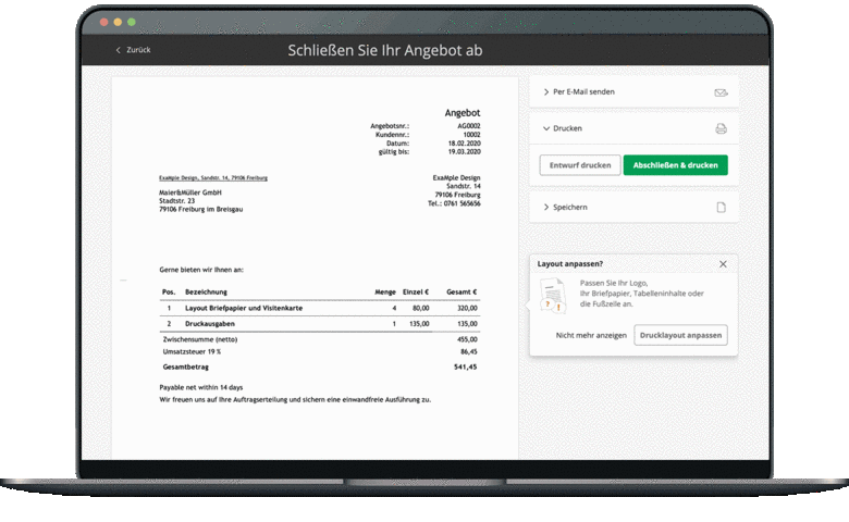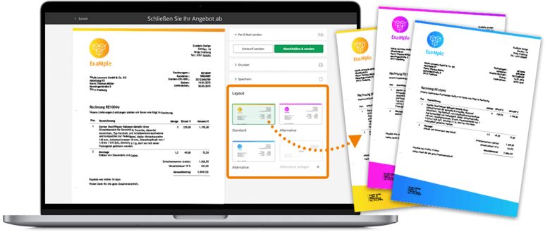 Designe ein individuelles Layout für deine Unterlagen und passe Rechnungen und Co. direkt an deine Werbematerialien an.