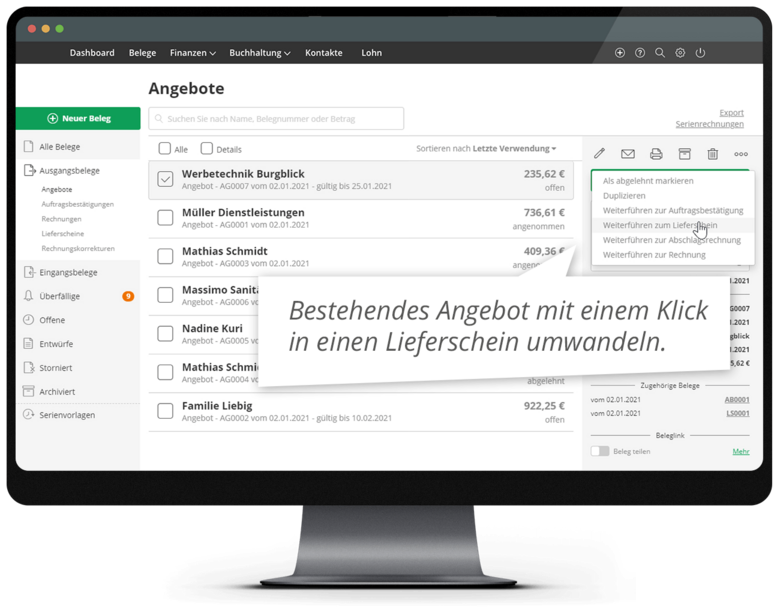 Wandle dein Angebote mit nur einem Mausklick in einen Lieferschein um.