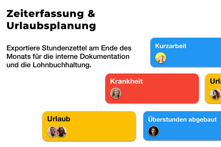 Entdecke die Möglichkeiten, die ACHIM deinem Unternehmen bei der Arbeitszeiterfassung und vielen anderen bürokratischen Problemen bietet. ACHIM hilft den Überblick über geleistete Arbeits- sowie Überstunden zu behalten. Er unterstützt bei der Urlaubsplanung der Mitarbeiter und informiert die Verantwortlichen in Echtzeit über eingetragene Krankheitstage.