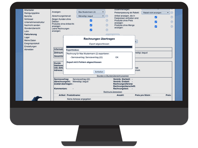 Serviceverträge können ohne Probleme auf den einzelnen Kunden abgestimmt werden, egal ob es sich um einen festen monatlichen Betrag, einen Stundensatz oder einen einmaligen Pauschalpreis handelt. Mit Ausgangspunkt in den geplanten Reinigungsaufträgen gestaltet CleanManager automatisch mit einem Klick sämtliche Rechnungen – die dann direkt an Lexware Office weitergegeben werden, damit diese an Deine Kunden weitergereicht und verbucht werden können.