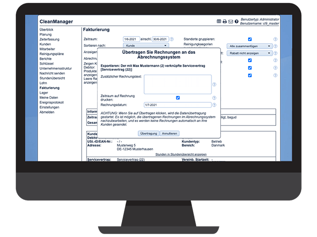 Mit der Softwareintegration von Lexware Office und CleanManager können Ihre Kundendaten schnell importiert und angeglichen werden. Rechnungen können somit ohne Probleme auf den einzelnen Kunden abgestimmt werden, ob es sich um einen festen monatlichen Betrag oder einen einmaligen Pauschalpreis handelt. Basierend auf den geplanten Reinigungsaufträgen und der automatischen Zeitauffassung, erstellt CleanManager mit einem Klick Rechnungen. Sie verbrauchen weniger Zeit für Büroarbeit, indem die Abrechnungen direkt an Lexware Office übertragen und weitergeleitet werden.