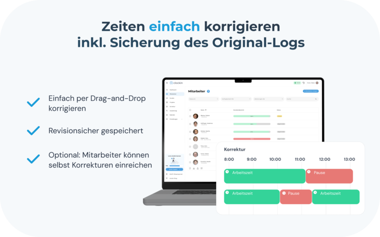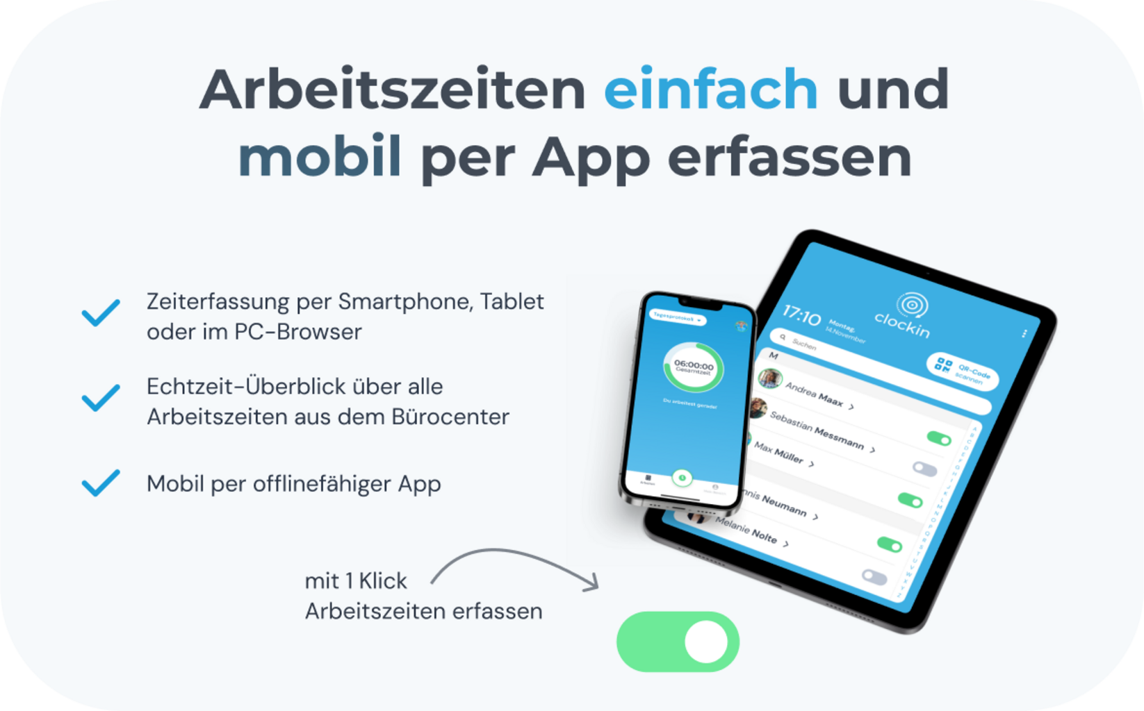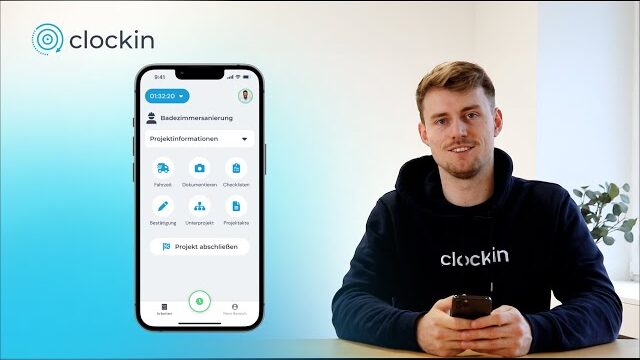 clockin ist eine App für Smartphones & Tablets, mit der Mitarbeiterinnen und Mitarbeiter ihre Arbeitszeiten einfach erfassen können. Gleichzeitig kann man Aufträge- und Projekte digital per Foto- und Notiz-Funktion dokumentieren und Skizzen anfertigen sowie Unterschriften digital einholen. In Echtzeit speichert clockin alle erfassten Informationen in digitalen Auftrags- und Projektakten ab. Nutzer haben so vom Büro aus jederzeit einen Überblick über Projektverläufe und können auf diesem Weg dank einfachem PDF-Export Leistungsnachweise für Kunden erstellen.