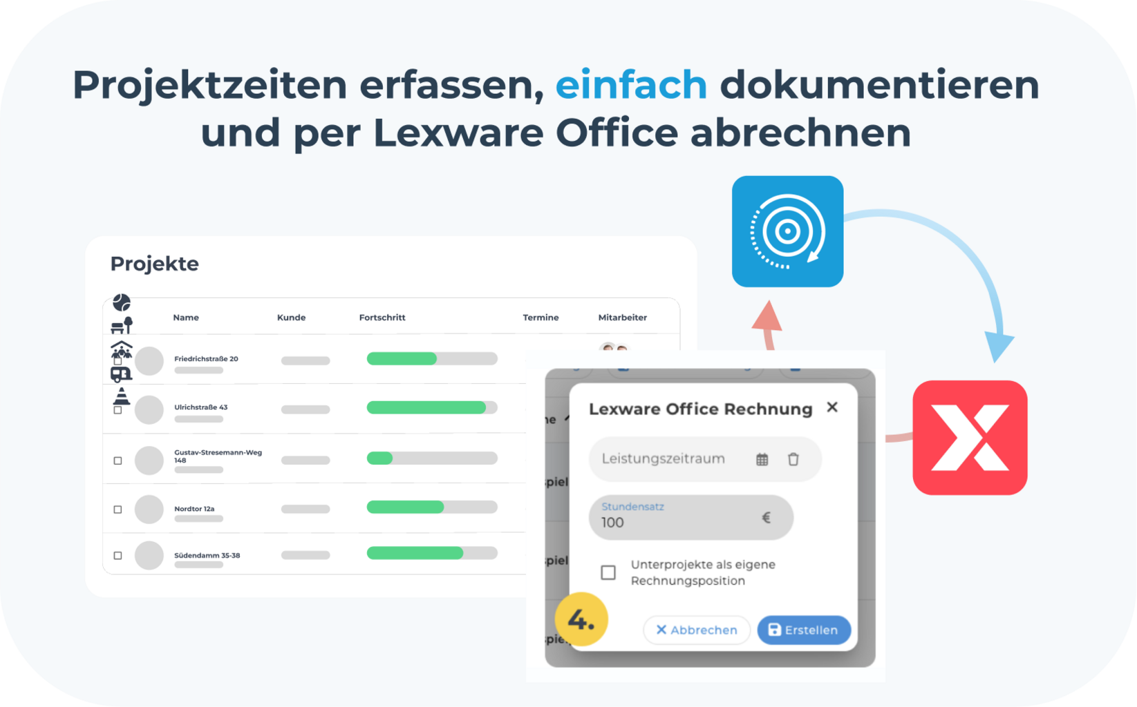 Kombiniere Lexware Office mit clockin um das Auftrags- und Projektmanagement von der Erfassung bis zur Abrechnung komplett digital abzuwickeln. Ohne einen einzigen Zettel.