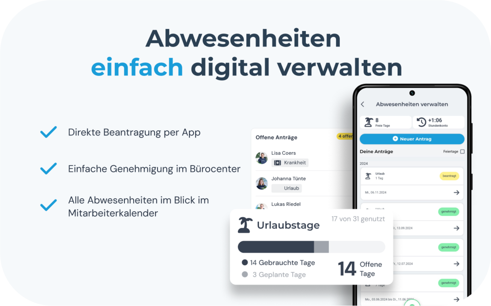 - Self-Service für Mitarbeiter (inkl. Abwesenheiten online beantragen)