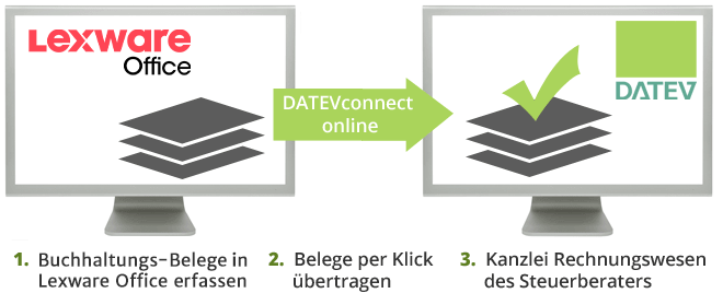 Mit den DATEV-Daten-Services bietet Lexware Office zwei effiziente Möglichkeiten, alle benötigten Beleg- und Buchungsdaten direkt online an die DATEV-Kanzleisoftware der Steuerberatung zu übermitteln.