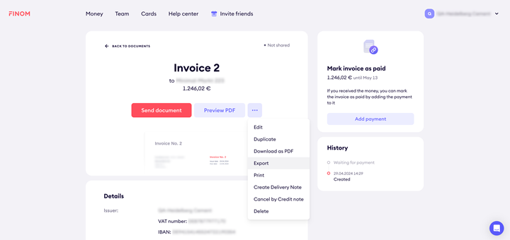 Du musst keine CSV-Dateien importieren oder Daten manuell übertragen – öffne einfach Deine Rechnung oder Deinen Beleg in der Finom-App und klicke auf „Exportieren“. Sie werden automatisch an Lexware Office gesendet und dort sicher gespeichert. Das war’s!