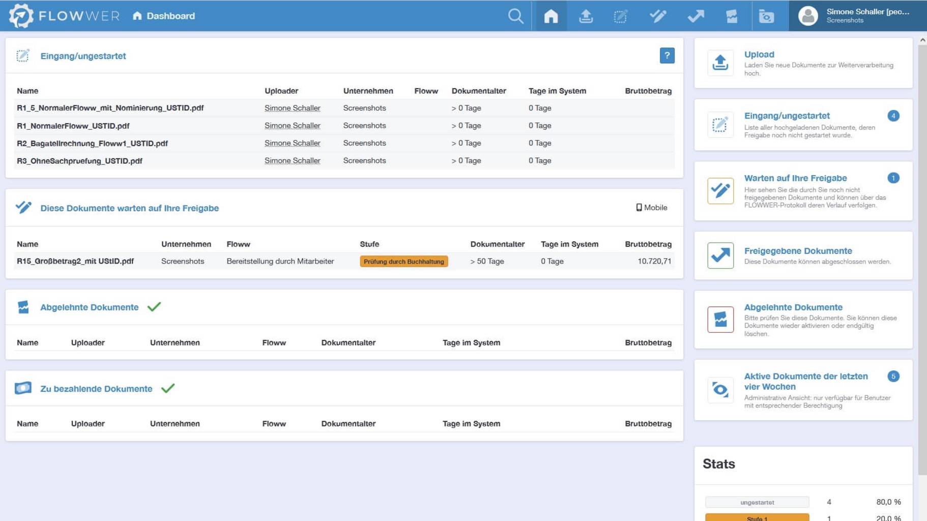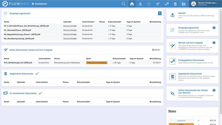 Flowwer ist eine webbasierte Belegfreigabe. Dabei sind unbegrenzt viele Freigabeprozesse definierbar mit unbegrenzt vielen Benutzern. In einem Dashboard sind mehrere Unternehmen abbildbar. Direkte Übergabe der Belege an lexoffice.