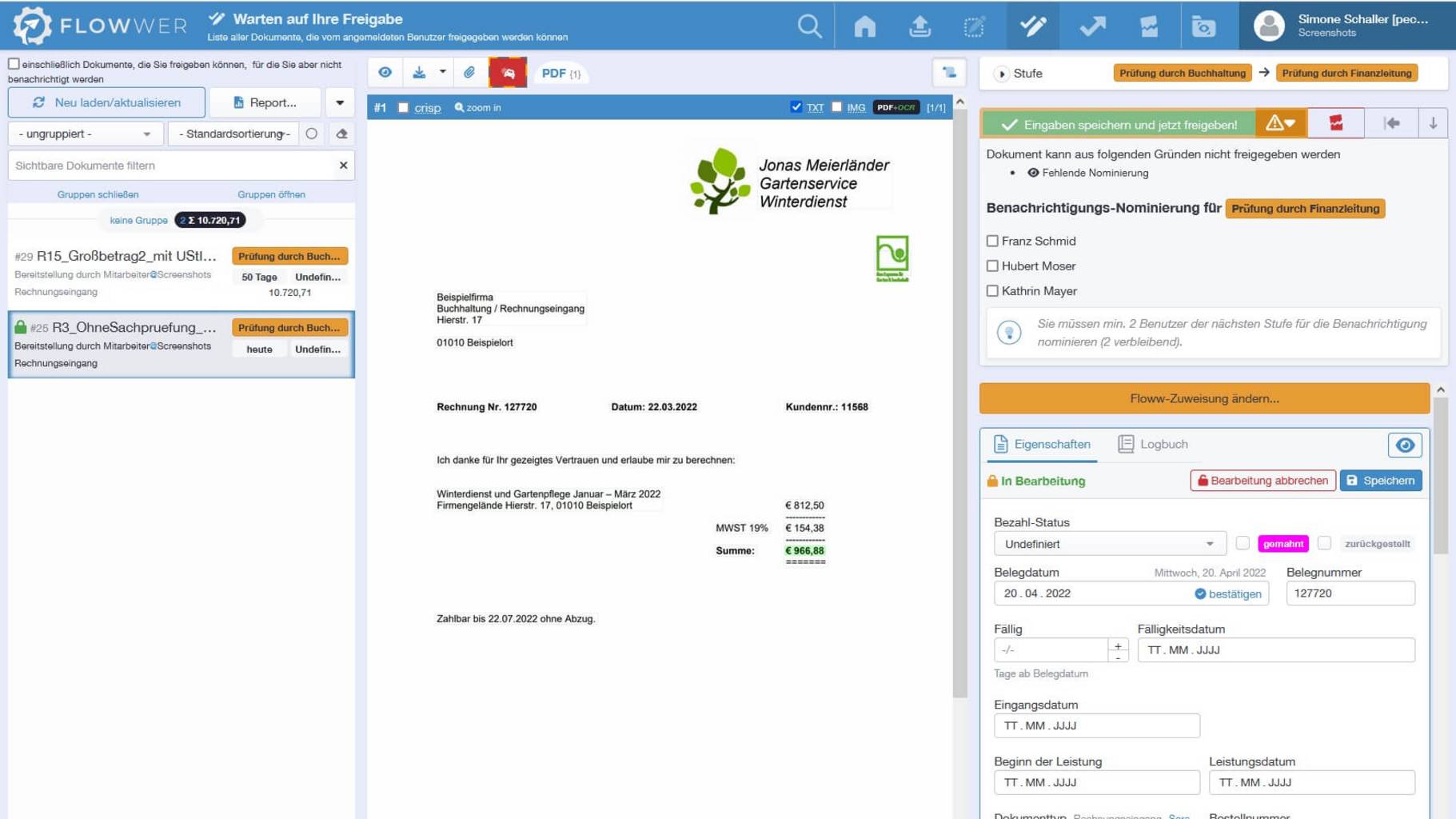 Mit FLOWWER wird die Belegfreigabe vollständig digitalisiert – ortsunabhängig, schnell und einfach. Ob ein- oder mehrstufige Freigabeprozesse: Es können unbegrenzt viele Benutzer und Freigabeprozesse genutzt werden, egal ob im Büro, Homeoffice oder unterwegs. Funktionen wie Belegaufteilung nach Konten, Kostenstellen und Positionen sowie Zahlungsverwaltung sind inklusive. Ein Logbuch sorgt für die rechtskonforme Protokollierung der Freigabehistorie.