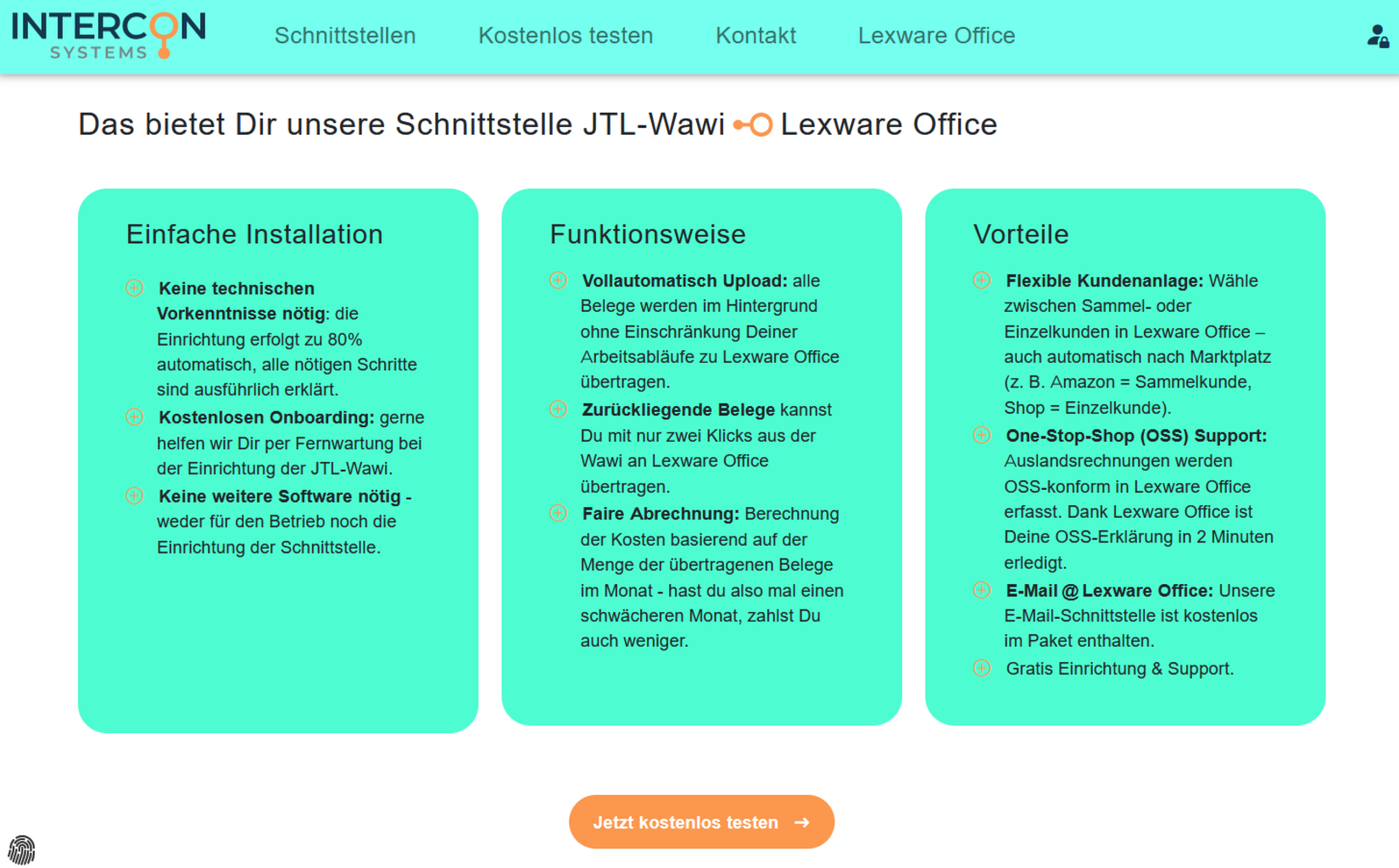 In unserem Kundenbereich den Menüpunkt „Konfiguration“ aufrufen, auf „Lexware Office verbinden“ klicken, im Lexware Office Konto anmelden und den Zugriff durch intercon-systems genehmigen. Sofern Deine JTL Wawi Datenbank aus dem Internet erreichbar ist, kann unsere Schnittstelle 80% der erforderlichen Einstellungen direkt in Deine Wawi importieren. Alle erforderlichen Einstellungen werden in einer Schritt-für-Schritt Anleitung ausführlich und leicht nachvollziehbar erklärt. Gerne können wir die notwendigen Einstellungen in Deiner Wawi auch in einem kostenlosen Onboarding Termin für Dich vornehmen.