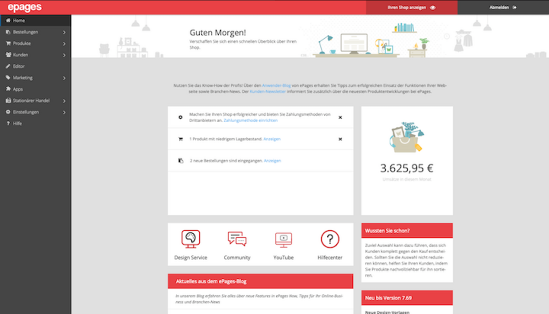 Der intuitive Administrationsbereich ermöglicht es Dir, im Handumdrehen einen eigenen Shop zu erstellen. Kostenlose Designvorlagen und das umfangreiche Support-Angebot rund um Hilfevideos, persönliche Beratung, Hilfecenter und Facebook-Community unterstützen Dich jederzeit. Fehlt Dir die Zeit oder hast Du spezielle Gestaltungswünsche? Dann bieten Dir die ePages-Designexperten eine individuelle Betreuung und Umsetzung Deines Shop-Designs zu einem Bruchteil der Agenturkosten. So erhält jeder Händler den perfekten Online-Auftritt für seinen Shop.