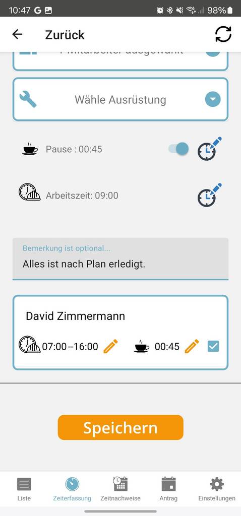 - Mitarbeiter erfassen ihre Arbeitszeit (optional mit GPS) bequem in der App.
