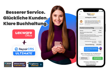 Digitalisierung mit Lexware Office und RepairCMS RepairCMS ist eine cloudbasierte Reparaturmanagement-Software. Ob Reparaturbetrieb, Kundendienst oder After-Sales-Team eines Herstellers – RepairCMS digitalisiert deinen gesamten Ablauf: von der Reparaturbuchung über die Kostenvoranschlag-Automatisierung bis hin zu Rechnung und Archivierung. Lexware Office übernimmt in diesem Verbund die Online-Buchhaltung: Eingehende Zahlungen werden automatisch mit den offenen Rechnungen abgeglichen und den passenden Belegen zugeordnet. Das spart viel Zeit und macht alle Abläufe effizienter. Lexware Office und RepairCMS bilden so eine ideale Kombination für ein durchgängig digitales Reparaturservice- und Zahlungsmanagement.