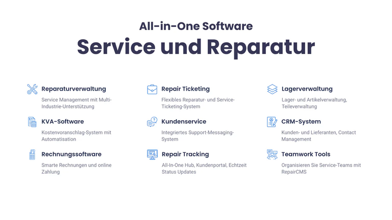 RepairCMS ist eine cloudbasierte Reparatur- und Service-Management-Software, die speziell für Reparaturbetriebe, Kundendienstabteilungen und Hersteller entwickelt wurde. Sie vereinfacht den gesamten Workflow, von der Annahme über Kostenvoranschläge und Rechnungsstellung bis hin zur Ersatzteilverwaltung und Kundenkommunikation.