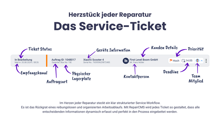 - Transparente Prozesse: Von der Ticketannahme über Werkstattprozesse bis zur Abrechnung – alles zentral dokumentiert, intern wie extern.