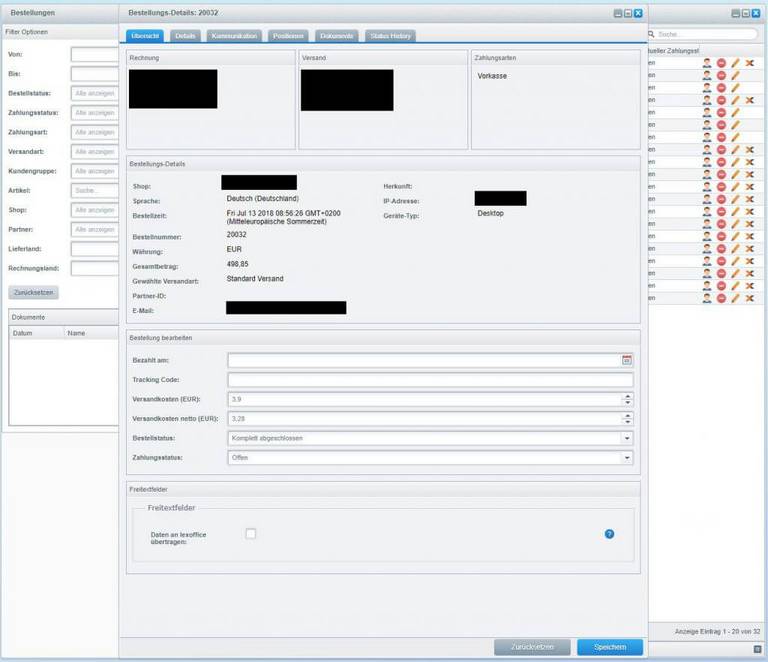 Aus dem Bestelllisting in Shopware ist es zudem möglich, die Bestelldaten manuell nach Lexware Office zu übertragen, damit die Belege in Lexware Office angelegt werden. Ab Shopware 6.5 können die in Lexware Office erstellten Belege jetzt auch zurück in den Shop zur Bestellung übermittelt werden.