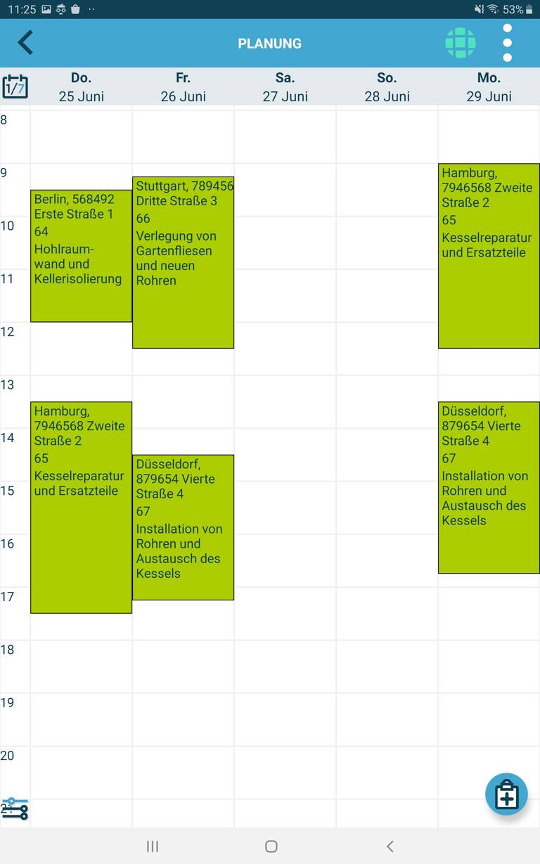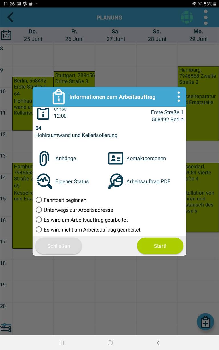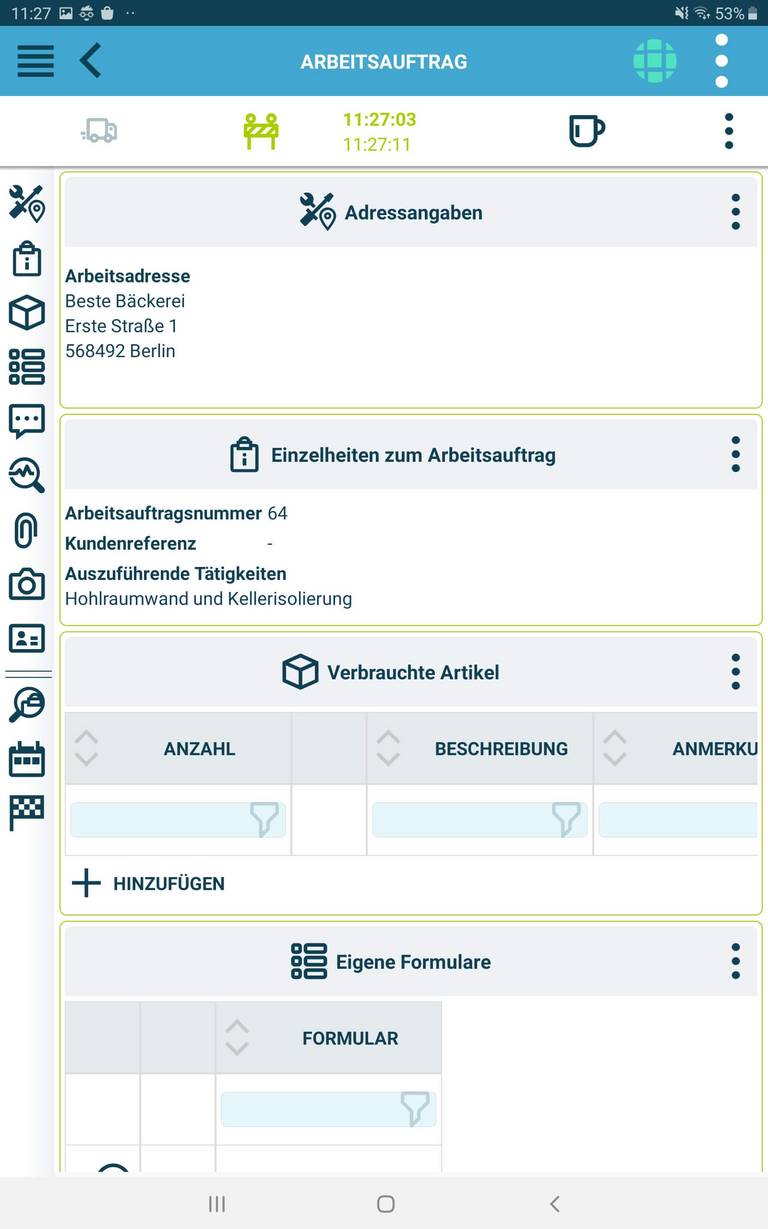 Als Außendienstmitarbeiter kannst du geplante und neue Arbeitsaufträge direkt aktualisieren und abschließen. Verwende die App (Feldmodul), um deine Planung einzusehen, zur Arbeitsadresse zu navigieren, Arbeitszeiten und Pausen zu erfassen und den Materialverbrauch zu dokumentieren.