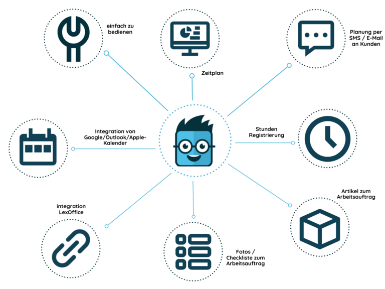 Von diesem zentralen Punkt aus kannst du ganz einfach Arbeitsaufträge erstellen und planen, Kundendaten verwalten und Materialien hinzufügen. Das Office-Modul synchronisiert sich in Echtzeit mit der App deiner Mitarbeitenden im Außendienst – so sind alle Informationen immer aktuell, egal ob es um neue Termine oder Änderungen geht. Das ständige Hin- und Hertelefonieren bei Änderungen gehört damit der Vergangenheit an.