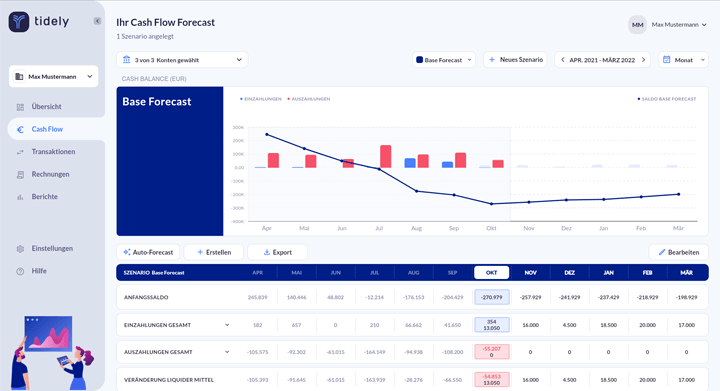 Durch die Anbindung von Lexware Office an Tidely werden deine offenen Rechnungen sowie wichtige Daten automatisch synchronisiert und in Echtzeit in die Liquiditätsplanung aufgenommen. Dies spart nicht nur Zeit und Nerven, sondern erhöht die Transparenz über deine finanzielle Situation. Heute sehen, wo du morgen stehst! Dank Auto-Forecasts und Szenarien hast du finanzielle Situation immer im Griff und kannst so fundierte Entscheidungen für dein Unternehmen treffen sowie deinen Cashflow optimieren. Ohne Setup-Aufwand, ohne veraltete Daten, ohne fehleranfällige Excel-Modelle.