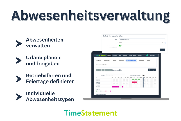 - Abwesenheitsverwaltung: Abwesenheiten verwalten, Urlaube planen und freigeben, Betriebsferien und Feiertage definieren sowie individuelle Abwesenheitstypen festlegen.