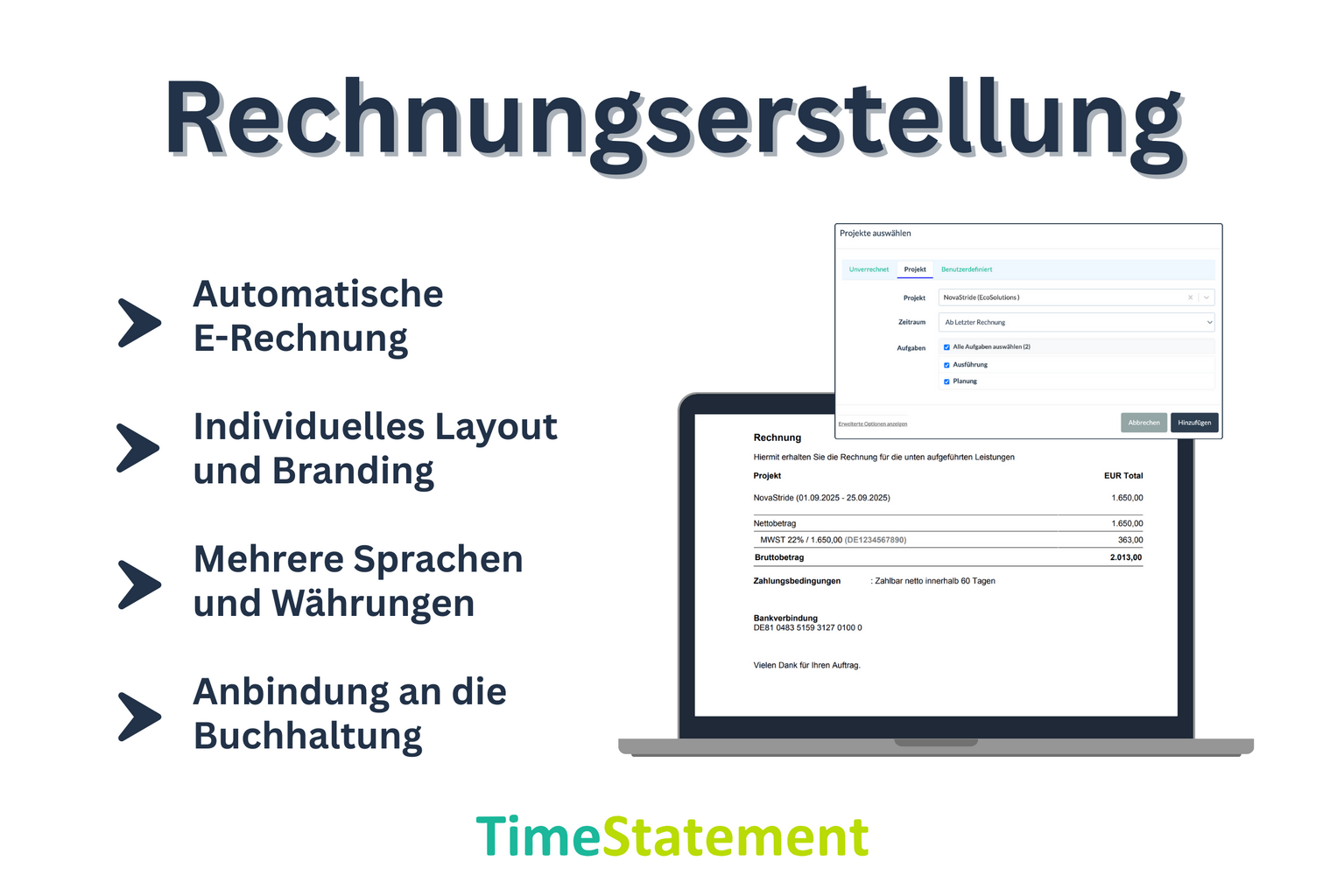 Mit TimeStatement erfassen du und dein Team Arbeitszeiten, Projektzeiten, Urlaub, Abwesenheiten, Spesen sowie Pausenregelungen einfach und effizient – alles in einem einzigen Tool. Rechnungen erstellst du direkt in TimeStatement mit nur einem Klick und übermittelst sie dank der nahtlosen Lexware-Integration automatisch an Lexware. So geht keine abrechenbare Stunde verloren. Auf diese Weise reduzierst du den administrativen Aufwand, vermeidest Fehler und gewinnst an Effizienz und Transparenz. Teste TimeStatement jetzt 14 Tage kostenlos und überzeuge dich selbst!