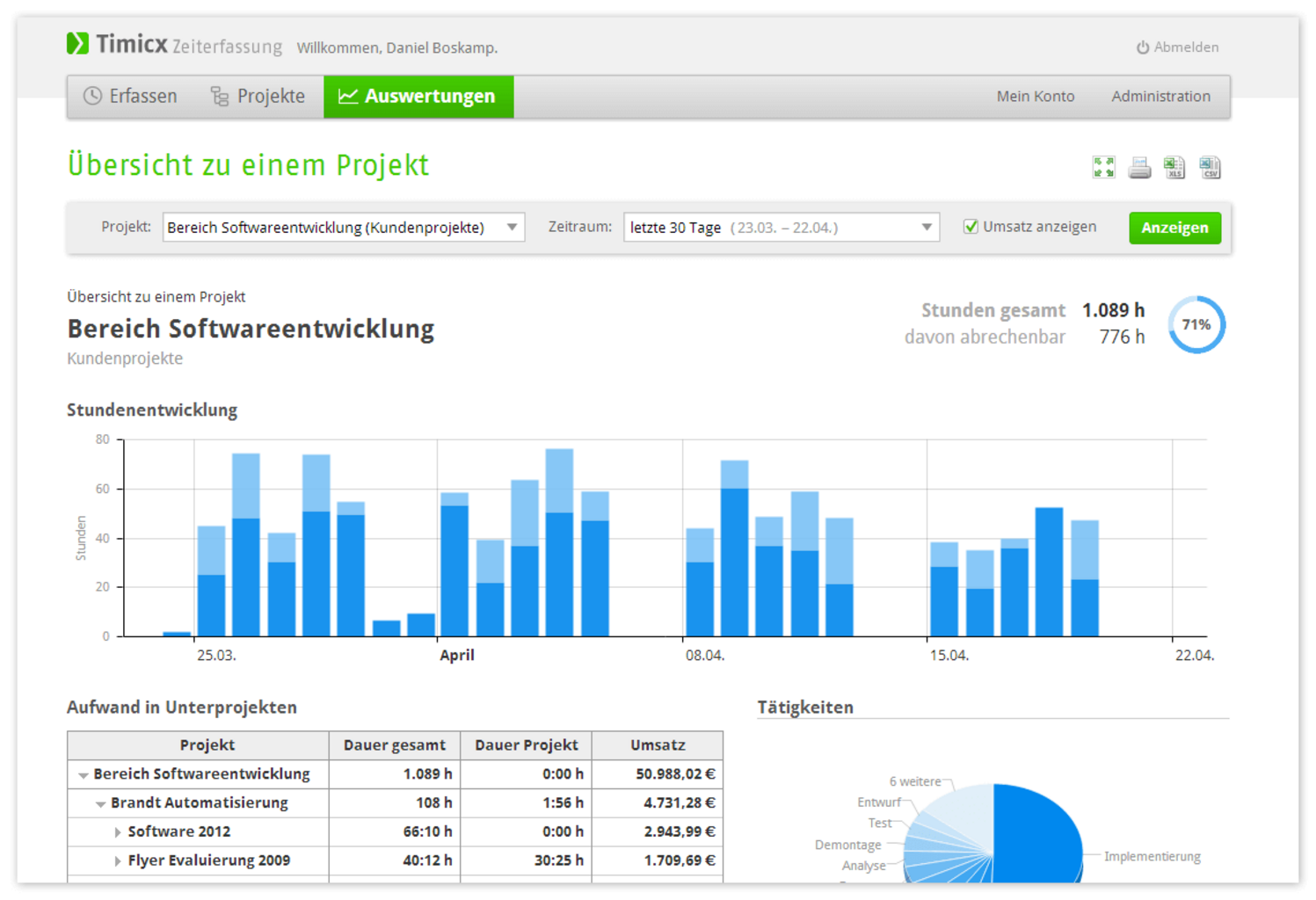 Timicx ermöglicht dir für die Abrechnung gegenüber deinen Kunden umfangreiche Festlegungen zu Stundensätzen nach Projekten, Tätigkeiten oder Mitarbeitern. Außerdem kannst du Projekten Kostenstellen und Kostenträger zuweisen, um die Aufwände aus der Projektzeiterfassung auch in deiner Kostenrechnung abzubilden. - Aussagekräftige Auswertungen
