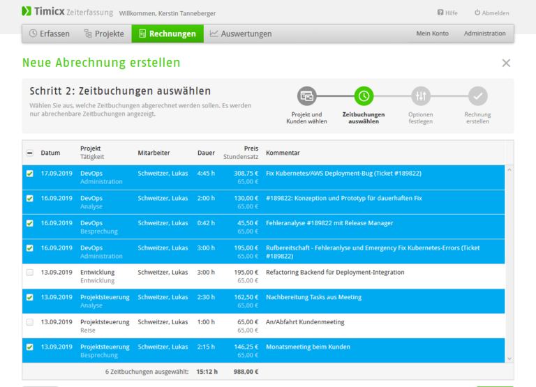 - Wähle die Zeitbuchungen aus, die du deinem Kunden in Rechnung stellen willst.