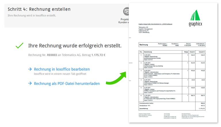 - Mit einem Klick generierst du eine fertige Rechnung mit deinen Projektstunden in Lexware Office.