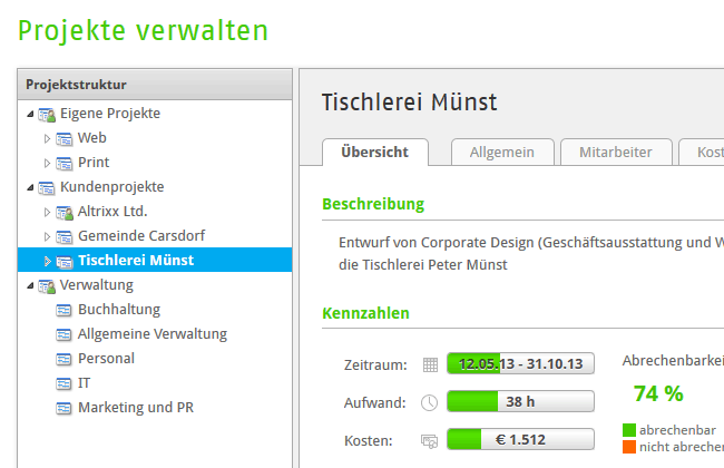 Du kannst deine Mitarbeiter mit verschiedenen Berechtigungen zu Projekten zuordnen. Mitarbeiter können für eine einfachere Handhabung auch zu Gruppen zusammengefasst werden. - Stundensätze und Kostenrechnung