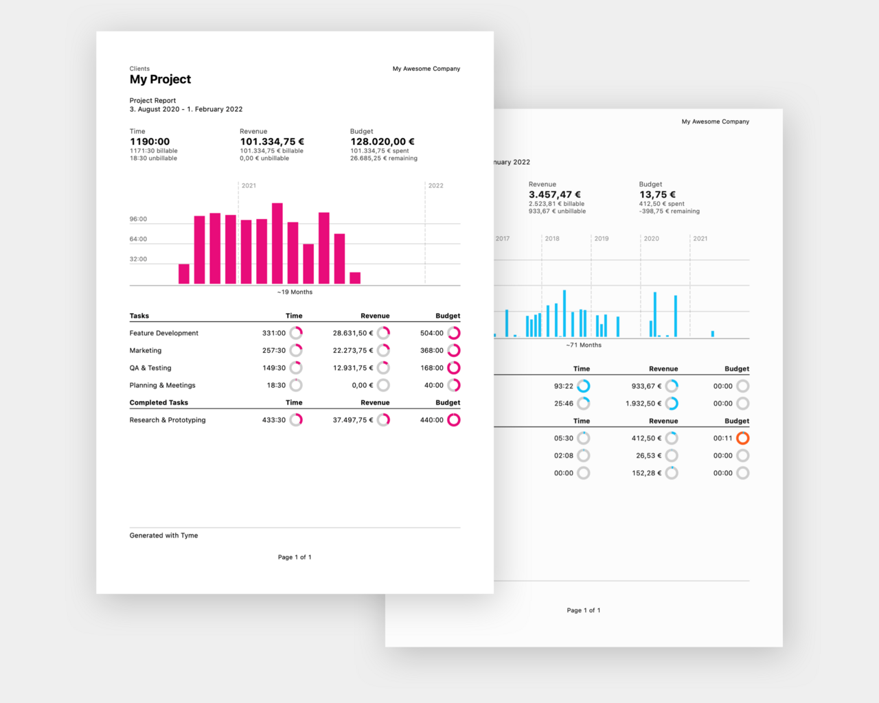 Mit Tyme kannst du und dein Team deine Arbeitszeiten auf Projekten, Aufgabe und Unteraufgaben bequem und in Echtzeit erfassen. Du legst Projekte und Aufgaben an und weisen diesen Stundenkontingente oder Budgets zu. Du kannst ebenso einfach Ausgaben (z.B.: Material oder Spesen) eintragen oder Fahrzeiten erfassen. Tyme erinnern dich an das Starten des Timers, das Ende deiner Arbeitszeit und die Mittagspause. So erhältst du fast wie von selbst einen sehr genauen Überblick über deine geleisteten Stunden, den Stand und das Restbudget deinen geplanten Zeitaufwänden und deine Auslastung.