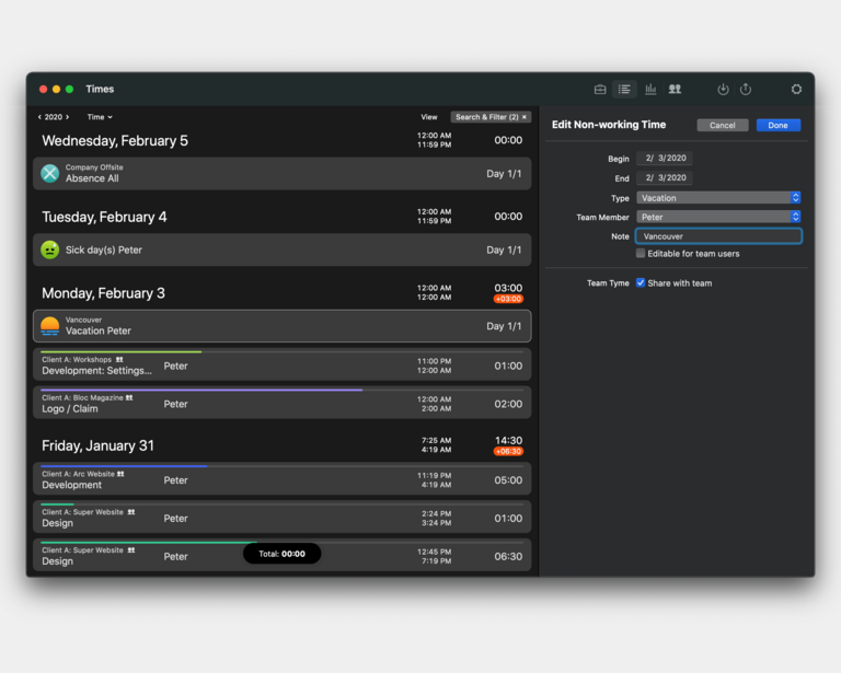 - Intuitives Design für einfache und schnelle Zeiterfassung auf Mac, iPhone, iPad und Watch