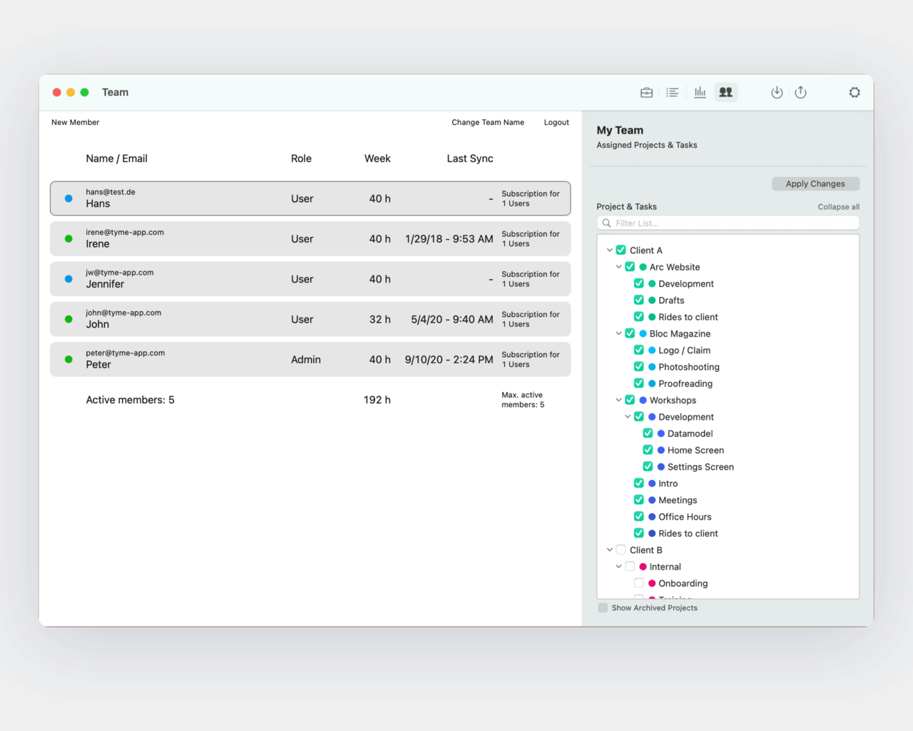 Tyme ist ein einfaches, aber mächtiges Zeiterfassungstool für Freelancer und Teams. Du erhältst einen schnellen Überblick über den Stand deiner Projekte, deine Abgabetermine und deine Auslastung – immer synchron auf all deinen Apple Geräten.