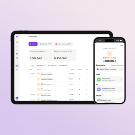 Vivid Business ist deine All-in-One-Plattform für Finanzen – für Unternehmen und Selbstständige. Leistungsstarke, intuitive Tools machen die Buchhaltung mühelos: Von Belegen bis Ausgaben – alles an einem Ort. Dank nahtloser Integration mit Lexware Office werden deine Dokumente automatisch übertragen und den entsprechenden Buchungen zugeordnet – kein manueller Aufwand, keine Zeitverluste. Einmal eingerichtet bleibt alles, dauerhaft gut organisiert. Vivid bietet klaren Überblick und smarte Automatisierungen für maximale Effizienz. Weniger Verwaltungsarbeit, mehr Fokus aufs Wesentliche.