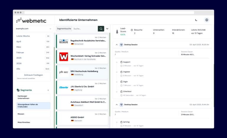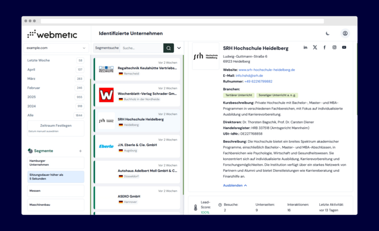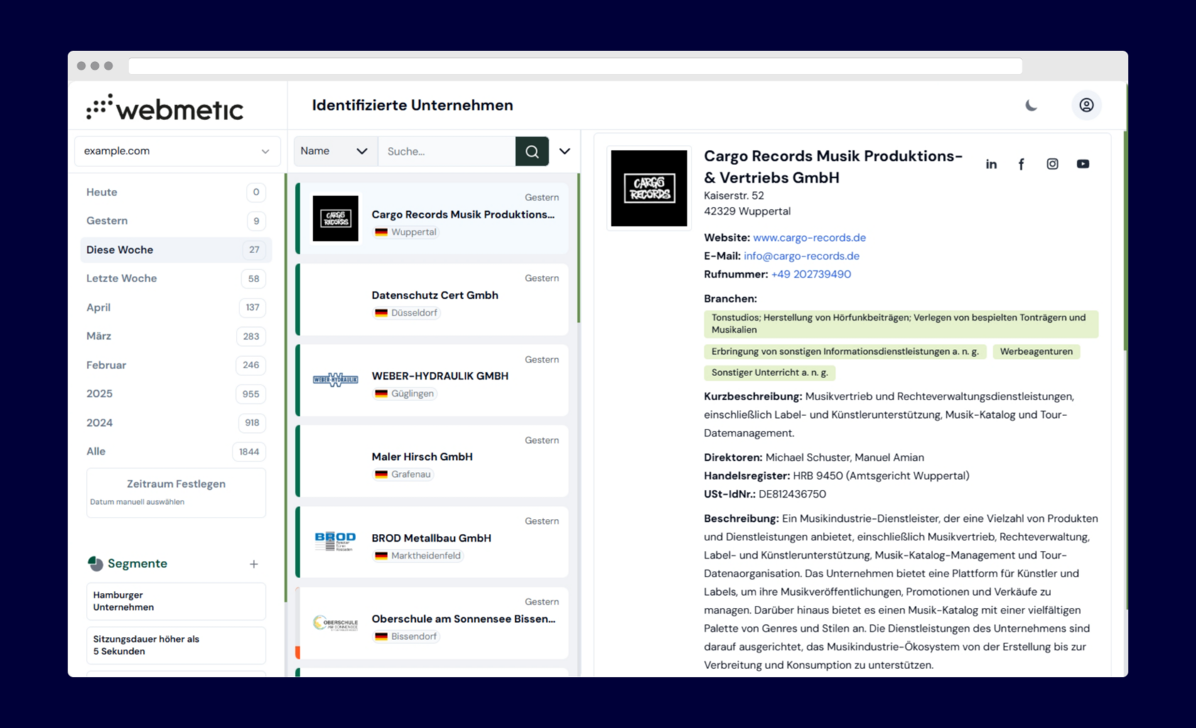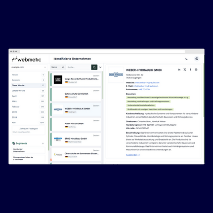Unsere proprietäre Technologie erkennt Unternehmensbesucher auf deiner Website in Echtzeit – vollständig DSGVO-konform und ohne Einwilligungspflicht. Du erhältst detaillierte Informationen wie Unternehmensname, Branche (NACE-Code), Standort und weitere Firmendaten, die für deine Buchhaltung und Vertriebsprozesse wertvoll sind.