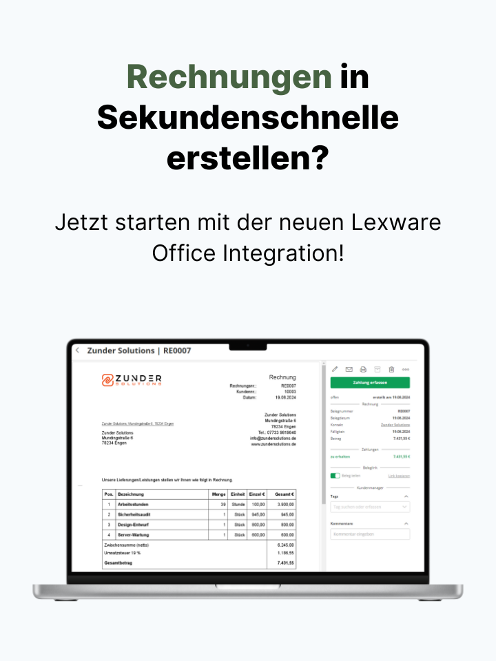 - Rechnungen in Lexware Office fertigstellen und direkt an den Kunden versenden