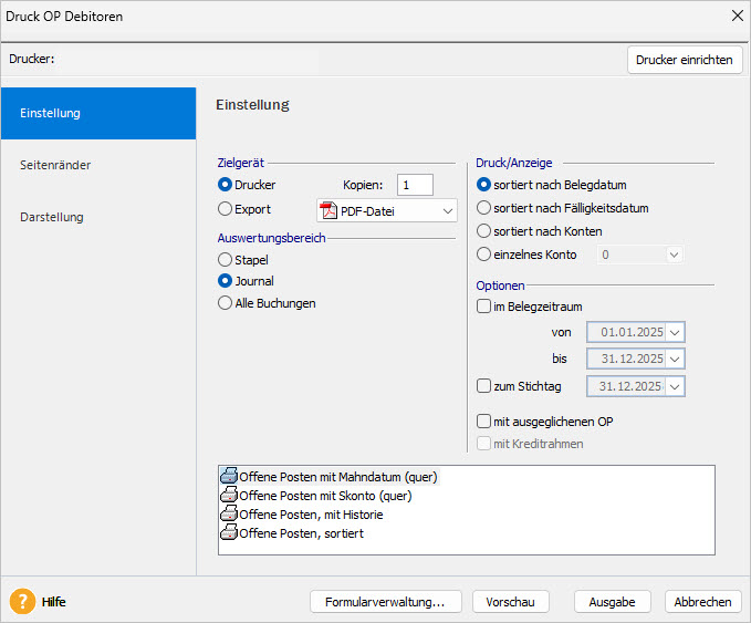 Die offenen Posten (OP) sind Grundlage des Mahnwesens und Zahlungsverkehrs. Für den Ausdruck der OP-Liste stehen verschiedene Varianten zur Auswahl.
