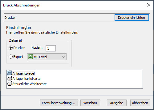 - Berichte 'Anlagenspiegel' und 'Anlagekartei'.