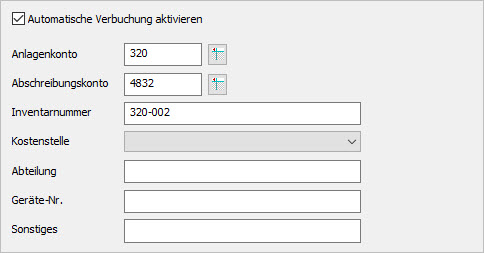 - Prüfen Sie die vorgeschlagenen Konten für das Anlagekonto und das Abschreibungskonto. Sie können die Vorschläge überschreiben.