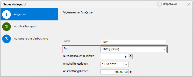 Um ein Anlagegut mit dieser Abschreibungsart zu erfassen, wählen Sie auf der Seite 'Allgemein' den Typ 'PKW (Elektro)'.